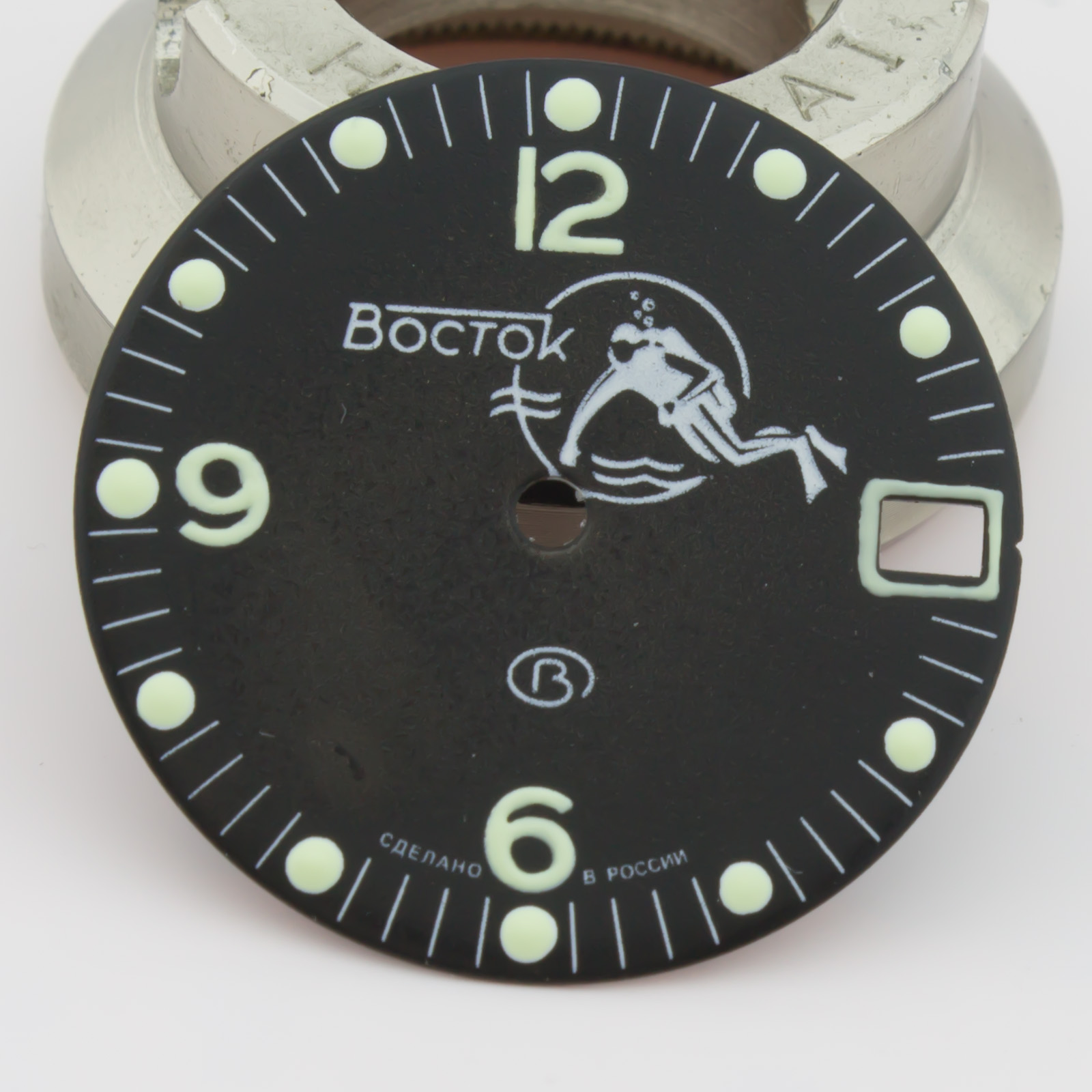 Diameter of dial is 28.5mm - fit to all models of retro & modern Amphibia & Komandirskie cases. Fit well with stock and modern watch hands. Produced by Favinov’s Enthusiast team. Fitted to mechanical movements - Vostok 24XX (2409, 2414, 2415, 2416, 2428, etc).