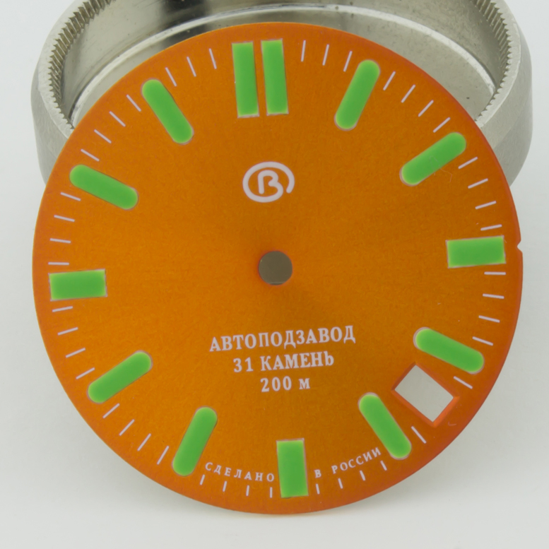 This model of dial produced and lumed by Favinov's Team. Minor defect is that lume on symbols is some grainy - check enlarged photos below please. Diameter of dial is 28.5mm - fit to all models of retro & modern Amphibia & Komandirskie cases. Fit well with stock and modern watch hands. Produced by Favinov’s Enthusiast team. Fitted to mechanical movements - Vostok 24XX (2409, 2414, 2415, 2416, 2428, etc). All photos are 100% actual, press photos below for enlarge please.