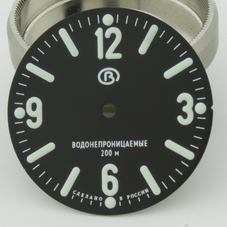 This model of dial produced and lumed by Favinov's Team. Has a minor defect - little scratch between 12 and 1 o'clock, symbols glows VERY bright and GOOD time. Diameter of dial is 28.5mm - fit to all models of retro & modern Amphibia & Komandirskie cases. Fit well with stock and modern watch hands. Produced by Favinov’s Enthusiast team. Fitted to mechanical movements - Vostok 24XX (2409, 2414, 2415, 2416, 2428, etc). All photos are 100% actual, press photos below for enlarge please.