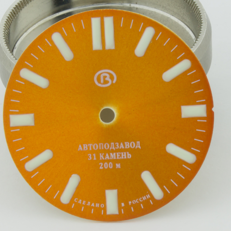 This model of dial produced and lumed by Favinov's Team. Has a minor defect - little scratch near the center of dial. Diameter of dial is 28.5mm - fit to all models of retro & modern Amphibia & Komandirskie cases. Fit well with stock and modern watch hands. Produced by Favinov’s Enthusiast team. Fitted to mechanical movements - Vostok 24XX (2409, 2414, 2415, 2416, 2428, etc). All photos are 100% actual, press photos below for enlarge please.